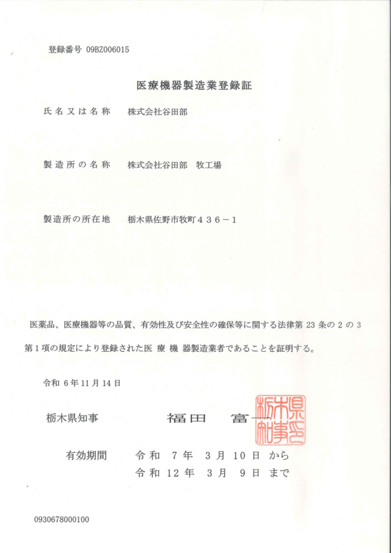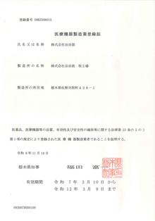 | 医療機器製造業 許可証 許可番号 09BZ006015 |